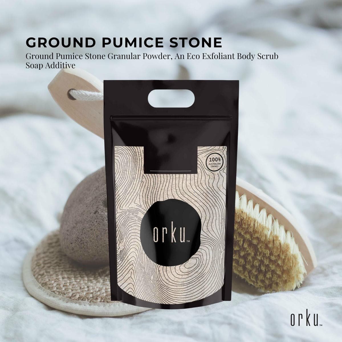 Orku Pumice Ground is perfect for all your exfoliant needs. Add to soaps, hand cleaners, foot scrubs, or body care products that crave a little bit of abrasion.