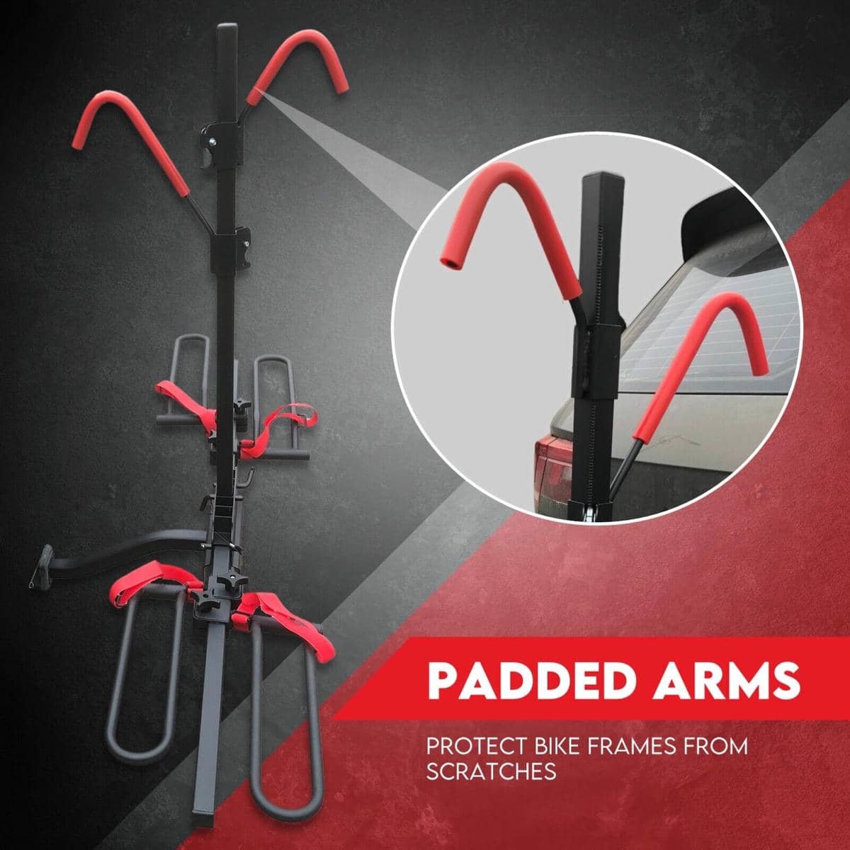 The padded hook slides on the bike rack to accommodate different sizes of bikes while preventing scratches and scuffs, and the hook pin prevents the hook from loosening and dislodging during travel. The rack also comes with reflectors for safer night driving.