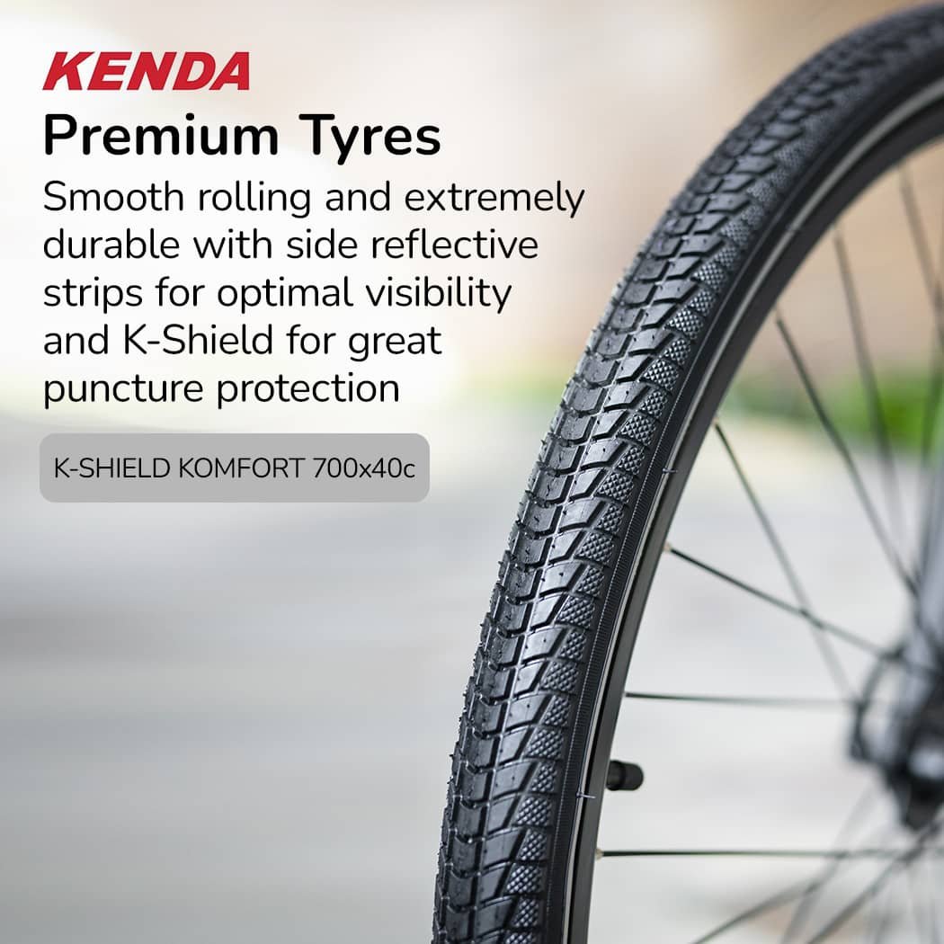 - Tyres: Kenda K841A K-Shield Komfort (700x40c) w/ reflective strips