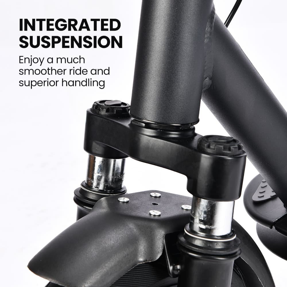The scooter’s design is ideal for adults and teens alike, featuring a long deck for enhanced control. The 10-inch airless tyres, significantly larger than competitors’, work seamlessly with the ActivShok front suspension system to ensure a smooth ride over any bumps.