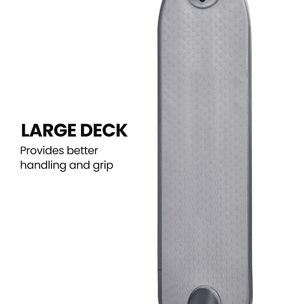 The scooter’s design is ideal for adults and teens alike, featuring a long deck for enhanced control. The 8.5-inch airless tyres work with the rear torsion plate to absorb shock and dampen vibration.