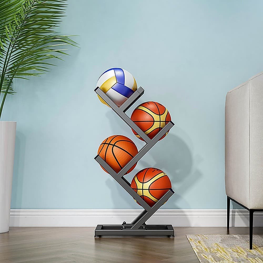 Constructed from high-quality iron, this versatile rack is strong and durable, featuring securely welded connections that resist breakage. Its stable rectangular base ensures stability without the risk of tipping. Suitable for a variety of sports balls including footballs, baseballs, rugby balls, volleyballs, and basketballs, as well as other sports equipment, it is perfect for use in garages, homes, storage rooms, playrooms, gyms, schools, shops, and workplaces.