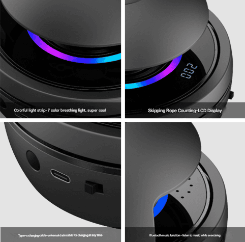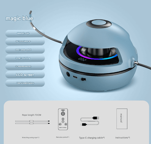 - Functions: Automatic Rope Rotation, Jump Counting, Bluetooth Speaker, Adjustable Speed, LED Lights