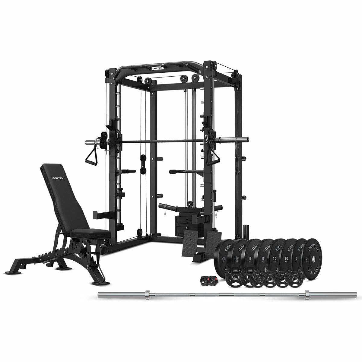 Get everything you need in one go to kick start your home gym setup with the Cortex SM20 Smith Station with Olympic Tri-Grip Weights, Bar and Bench Set. The SM-20 Multi Rack offers a massive range exercise options on the smith machine, cable crossover, pull up bar and more. Customise your workout to match your strength level with 110kg total Weight Plates and a SPARTAN205 20kg Hardchrome Barbell with Lockjaw Collars. Workout with proper support on the BN-9 exercise bench which includes 8 levels of adjustable back rest & 4 levels of adjustable seat positions.