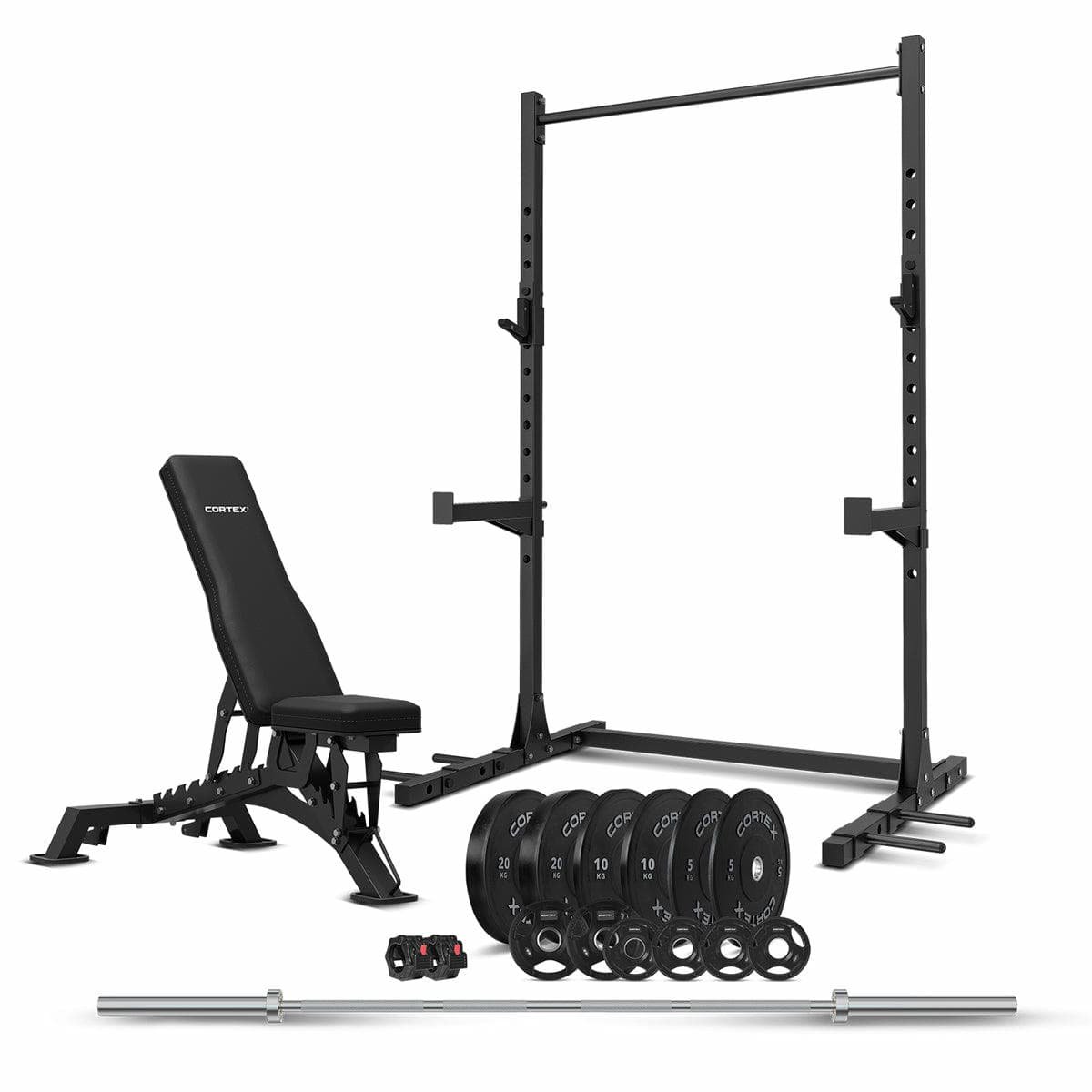 Enhance your workouts with our CORTEX SR-3 Squat Rack 100kg Olympic Bumper Weight + BN-9 Bench + Barbell Package. Olympic quality bumper plates and bar, paired with the versatile SR-3 squat rack featuring pull up bar and band pegs, lets you truly maximise your space. Combined with the versatile BN-9 exercise bench – you’ll be training in comfort with everything you need for a full body workout.