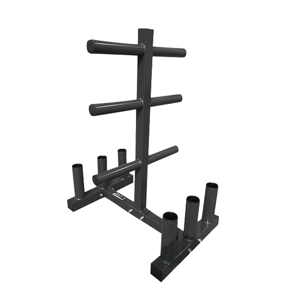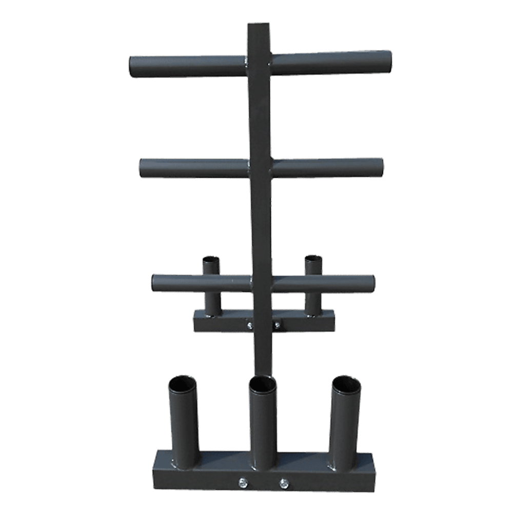 The rack accommodates Olympic-sized 51mm weight plates and 50mm Olympic bars. There is room for multiple plates on each of six weight plate spokes. Even better, six additional outside spokes give you a convenient place to store standard-sized gym bars.