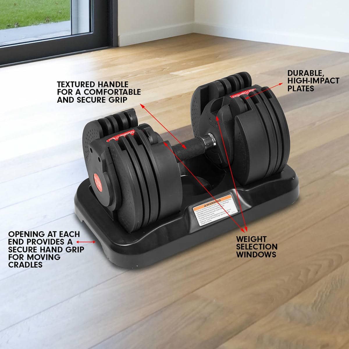The Powertrain Adjustable Dumbbell’s ergonomic design makes it the most space-efficient and flexible strength-training option available. With just the twist of a handle, you can automatically change your resistance on this dumbbell from 5 pounds all the way up to 45 pounds.