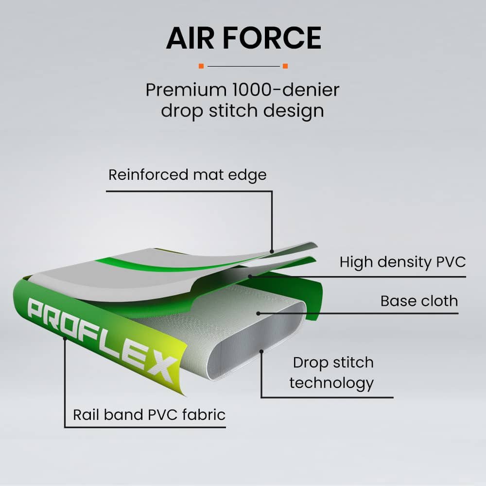 Engineered to be thick and durable, the Proflex Air Track is crafted with premium 1000-denier drop stitch technology and the combination of rail band and high density PVC fabric. Offering plenty of bounce and ensuring the right amount of stability. You’ll have the control you need to stick landings during even the most complex gymnastics or martial arts routines!