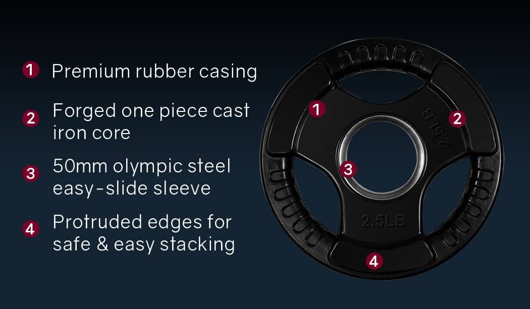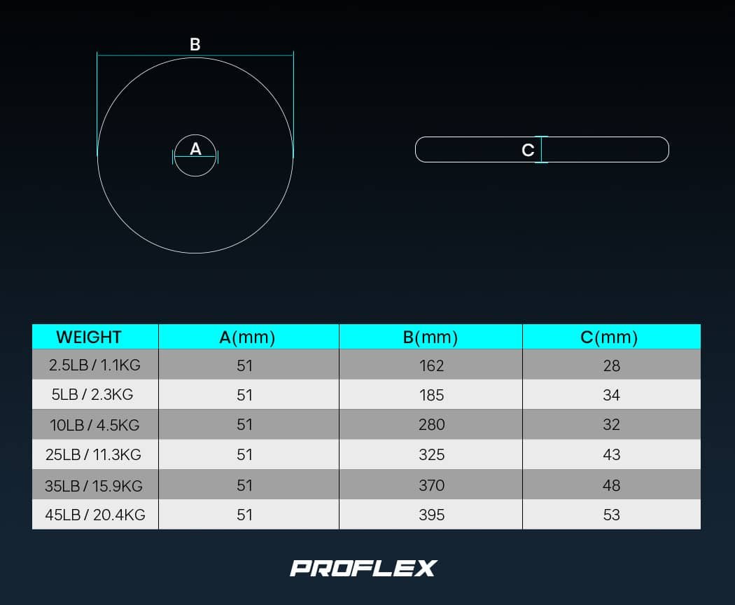 The JusBfit Series launched by Proflex is true commercial-grade gear that makes it ideal for anyone looking for gear that will stand the test of time. The range of Olympic Weight Plates are heavy-duty in structural integrity with one-piece forged construction and ergonomically engineered for comfortable and safe handling. They feature ultra-rugged, split, crack and peel resistant rubber casings to protect your floors and other equipment. The steel inner rings allow the weights to easily slide along an Olympic bar.