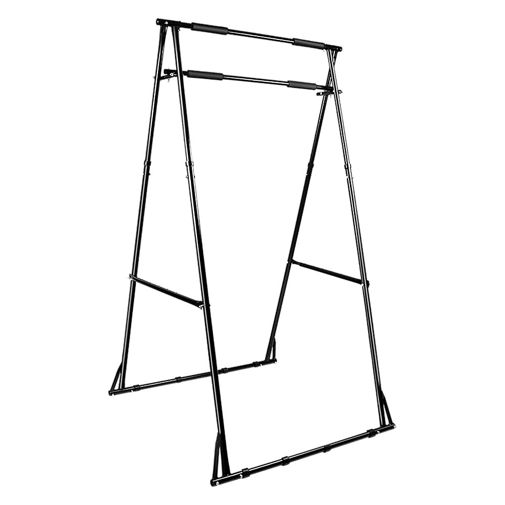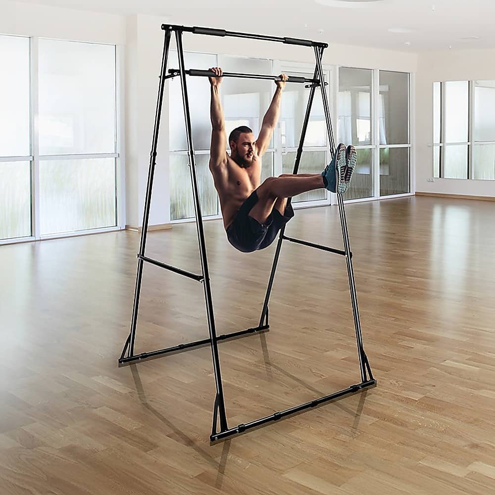 Its free-standing design allows you to move it easily around your house or even take it outside when weather permits. Unlike using a wall- or door-mounted pull-up apparatus, you can fold it up and stash it out of sight when guests arrive. It accommodates full body swings no knee bending needed to keep your feet off the ground. Soft, cushioned foam handle grips are easy on your hands, even during the most rigorous workout. Sturdy support bars reduce wobble by an incredible 92 per cent.