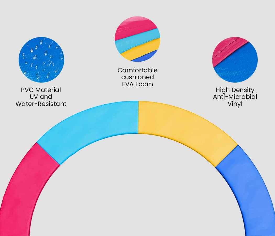 This universal design replacement padding is easily secured with elastic ties and fits over the springs of both curved pole and straight pole 12FT spring models of UP-SHOT and other brand trampolines. This high-quality edge-to-edge pad is made from waterproof UV resistant PVC material and high-density anti-microbial vinyl to provide protection from the elements. The thick and comfortable encased EVA foam allows for countless hours of comfortable cushioned fun!