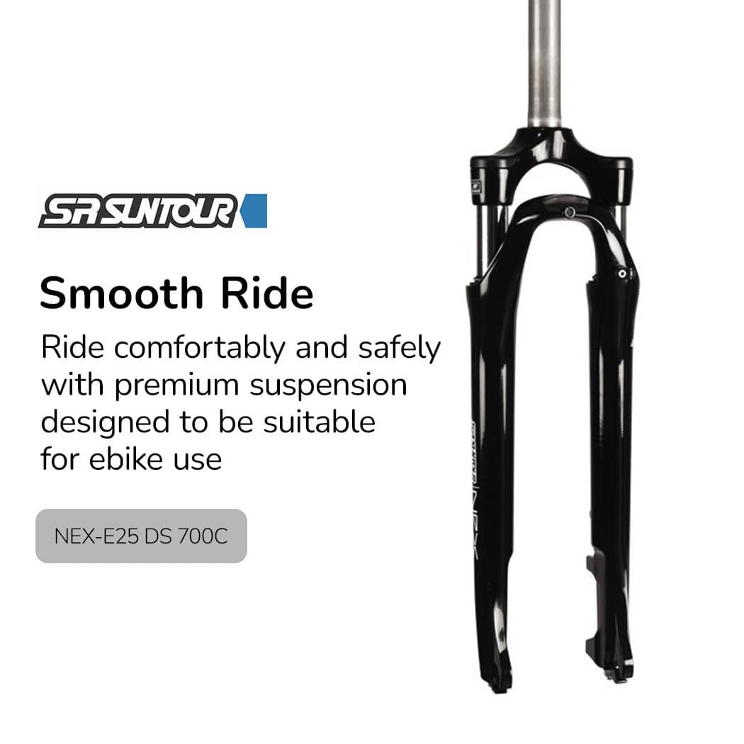 Suntour is one of the world’s renowned suspension brands and the NEX E-25 model is specifically designed to cater for the added weight of e-bikes. With 63mm of travel it is ideal for safe and enjoyable urban usage.