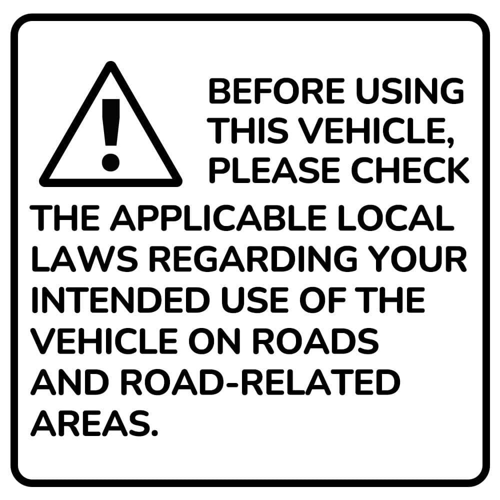 Note: Before using this vehicle, check the applicable local laws relating to your intended use of the vehicle on roads and road related areas. Models with a throttle may not be permitted to be used in areas accessible to the public. This product is intended for use on safe, dry, smooth and level hard surfaces – never for wet conditions, or for stunts. Always wear safety equipment.