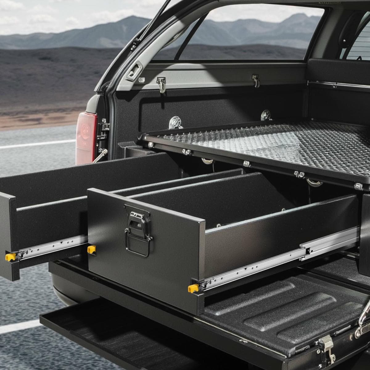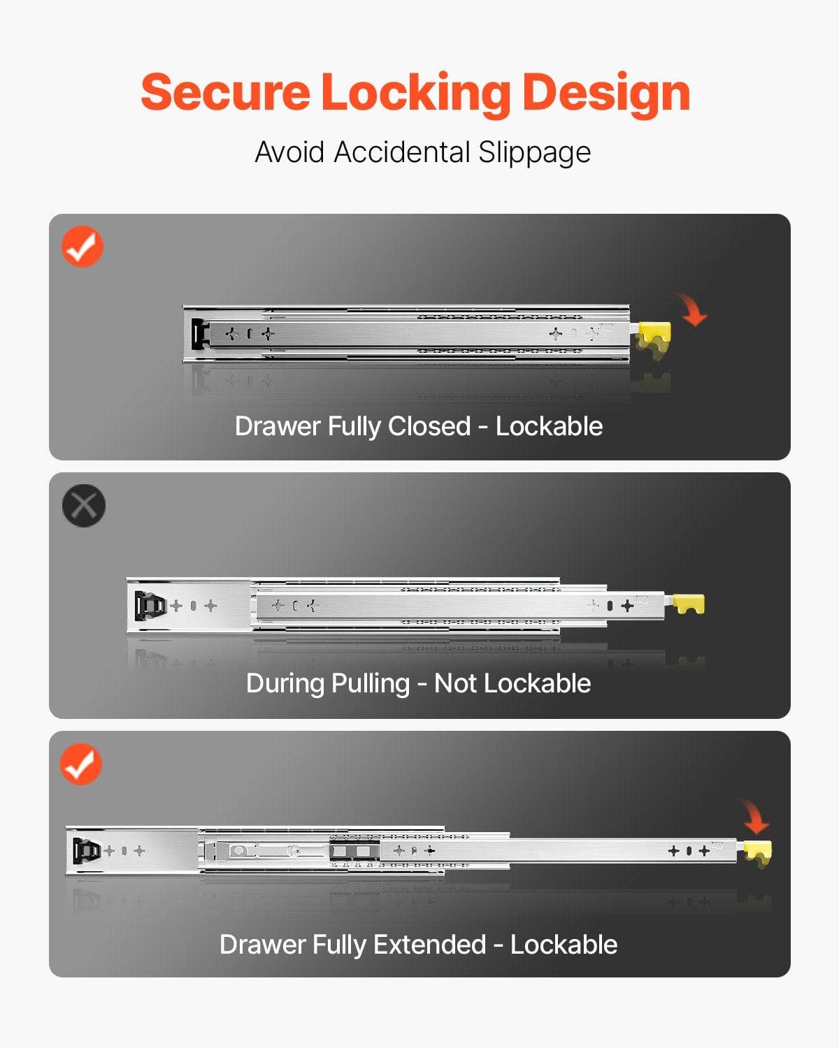 The full extension dresser drawer slides are equipped with a locking design that locks the slides with a simple press, ensuring that your items are secure and won’t slip off even in bumpy roads.
