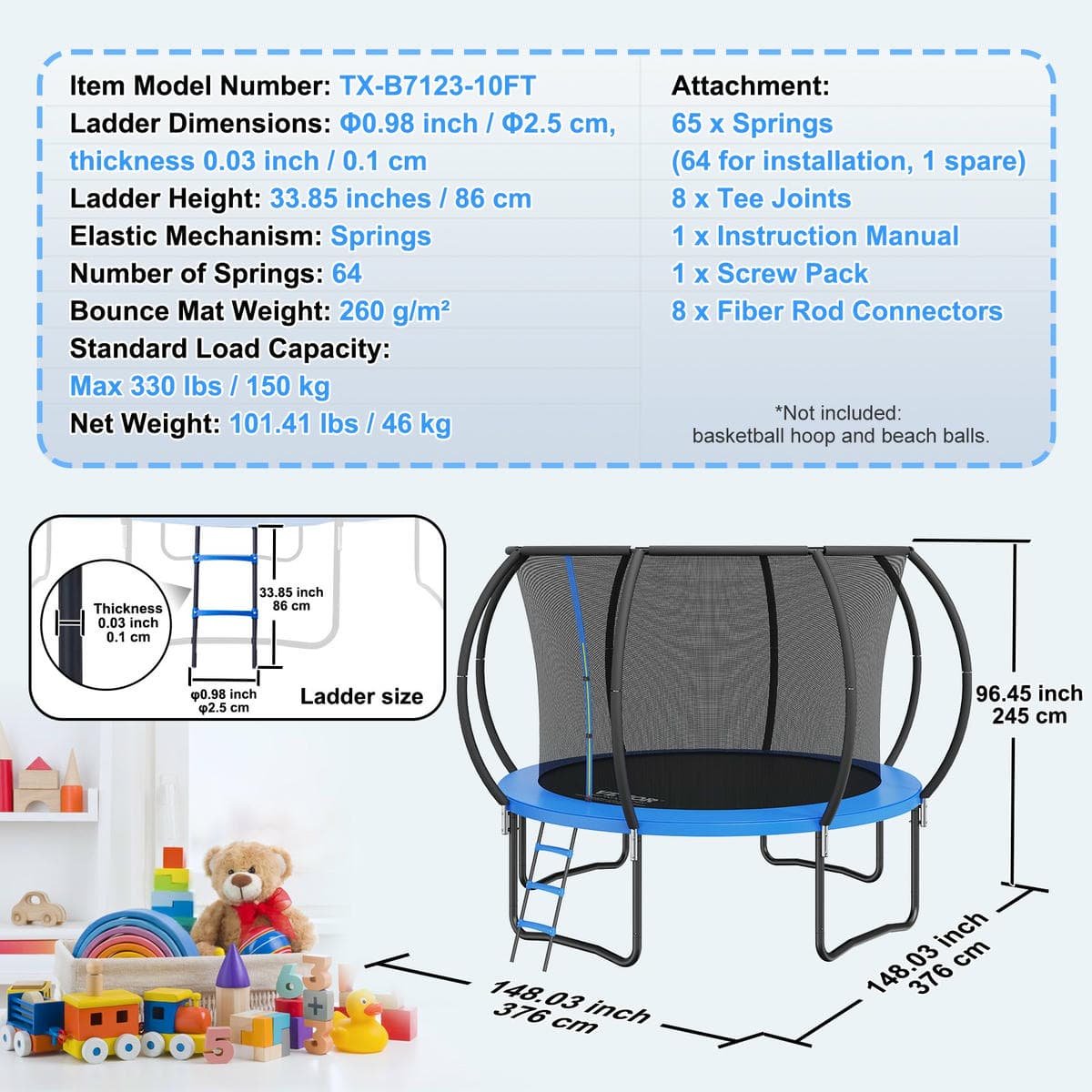 With a 33.85 inch / 86 cm high ladder, this heavy duty trampoline offers increased bounce height. It is equipped with 64 heavy-duty springs and a 260 g/m_ high-elasticity mat, providing outstanding bouncing power and helping children experience the joy of bouncing.