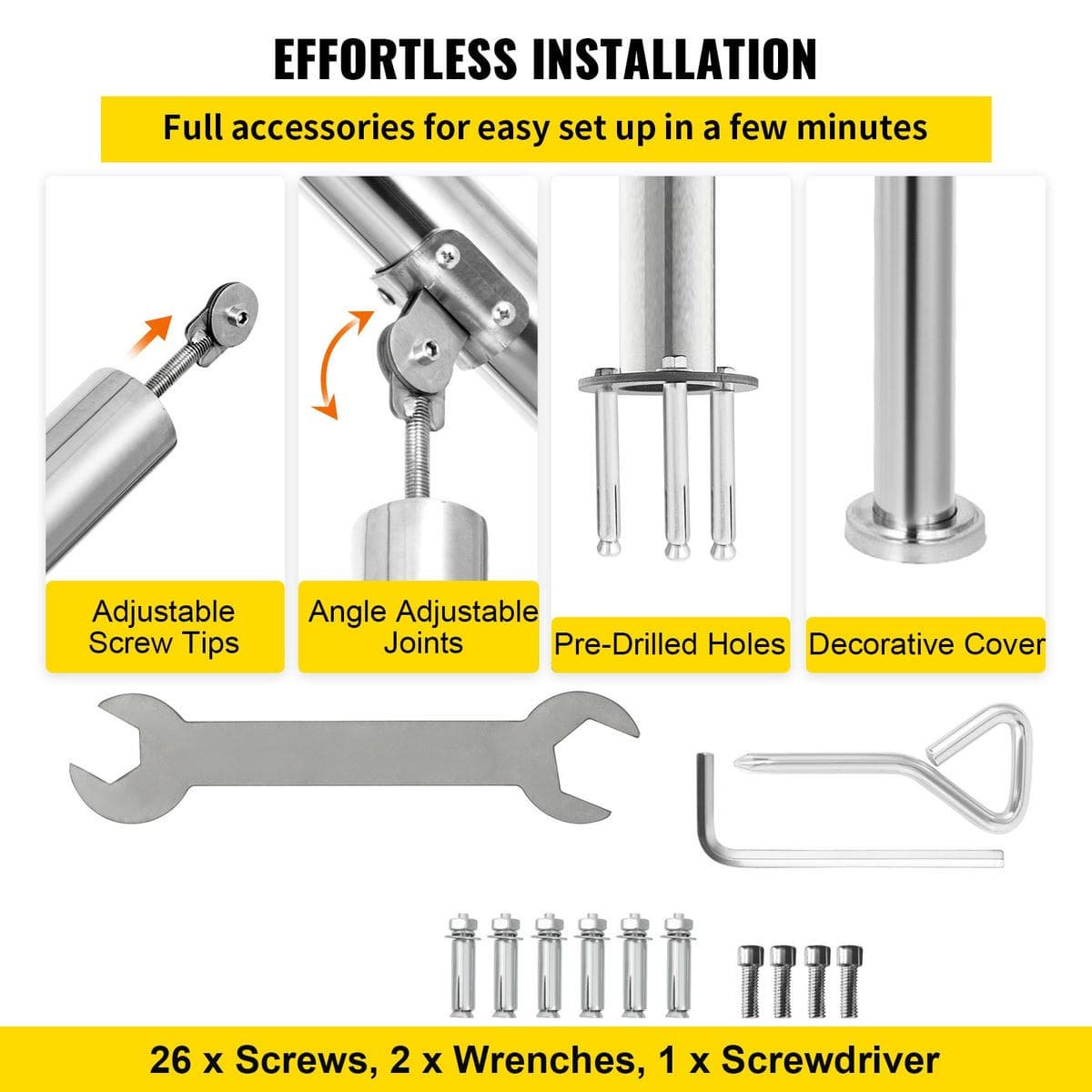 Accompanying the exterior railing for porch are complete accessories for easy installation, including screws, wrench, screwdriver, etc. Just choose your desired location, mark it, drill holes on the mounting surface, set up screws with three ÔøΩÔøΩ0.35″/9 mm pre-drilled holes, and finally place base trim.