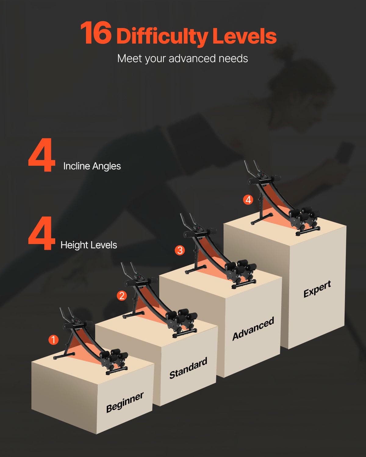 With 4 incline angles and 4 height settings, the home gym strength training ab cruncher offers a total of 16 difficulty levels, catering to both beginner and advanced training needs, continuously providing varying intensity for the abs while accommodating different heights and strength levels.