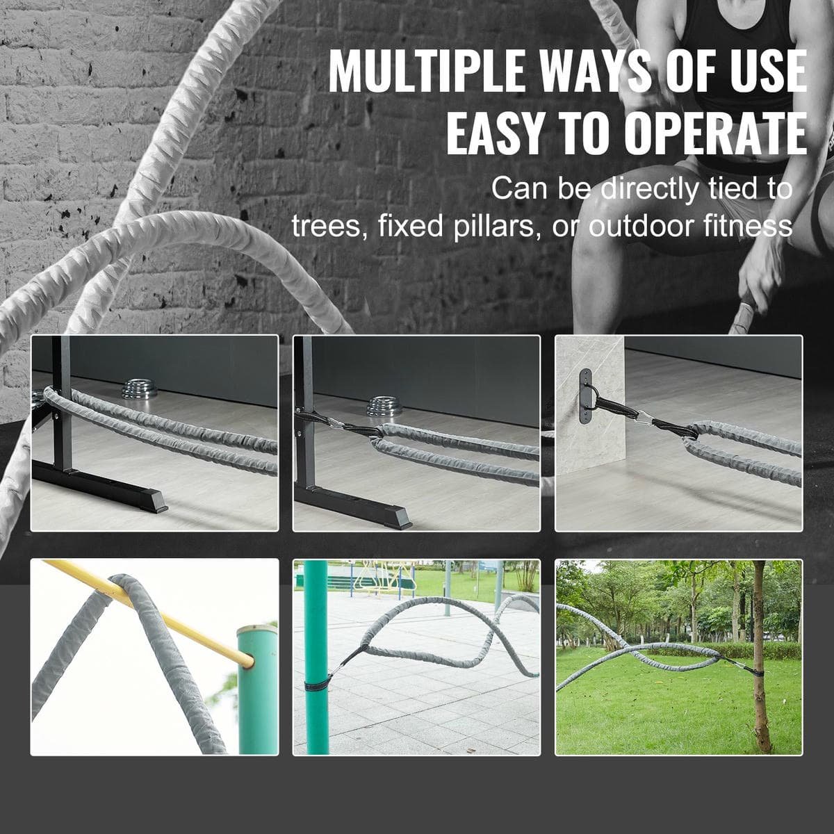 The heavy ropes for home gym can be easily rolled up for compact storage and is designed for portability. It can be used for up-and-down, pulling, or climbing exercises – known as combat ropes, workout ropes, or training ropes.