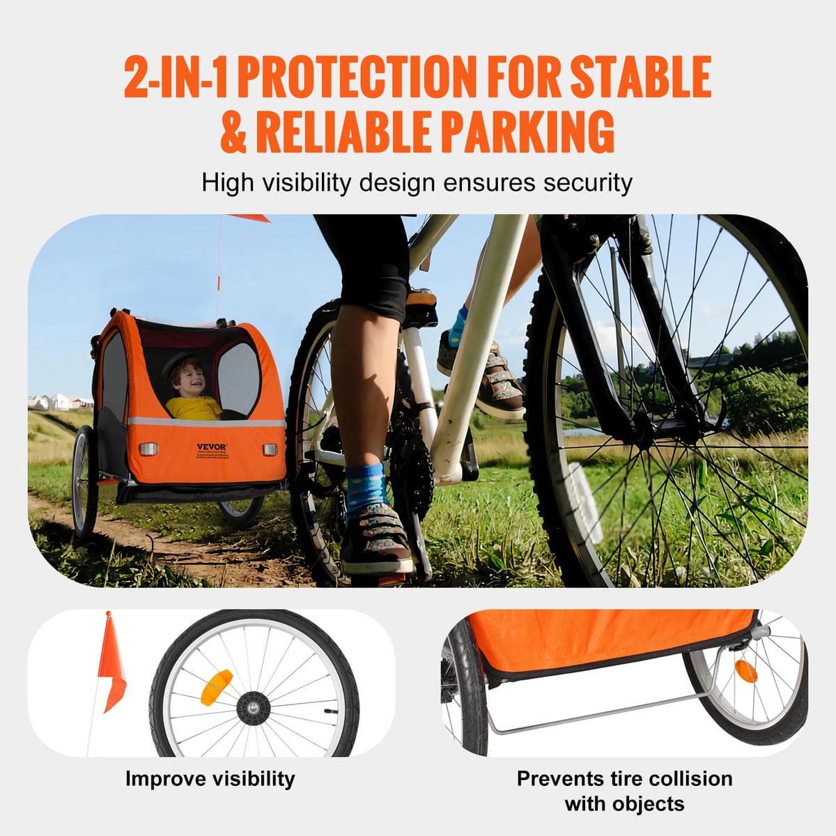 With an all-round protection and a secure parking feature, our bicycle trailer keeps your wheels safe from harm and ensures a stable stop. Plus, bright reflectors make sure you’re seen during the ride, adding an extra layer of security.