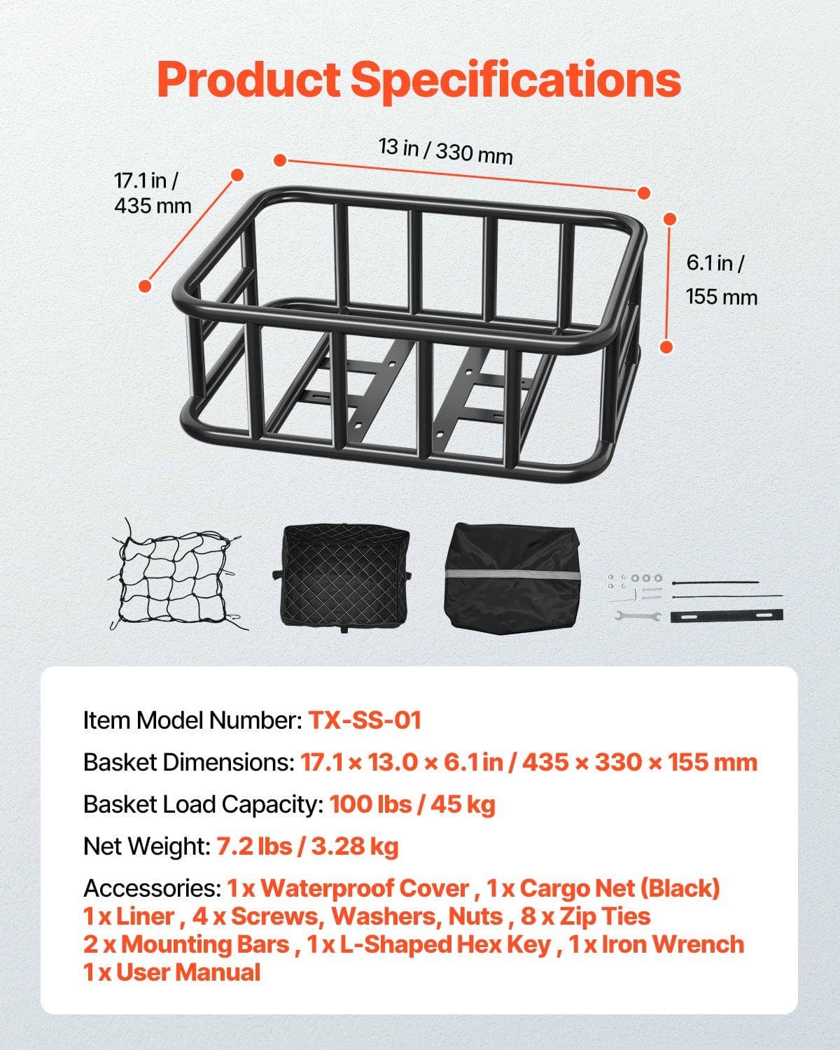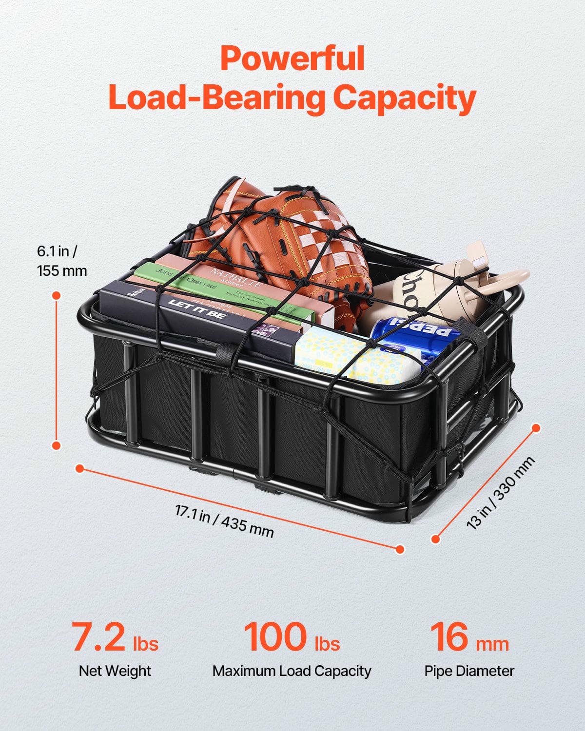 The bicycle basket holds up to 110 lbs(45 kg), offering ample space for groceries, pets, or luggage. Weighing just 7.2 lbs(3.28 kg), itÔøΩÔøΩs durable and ideal for daily use.