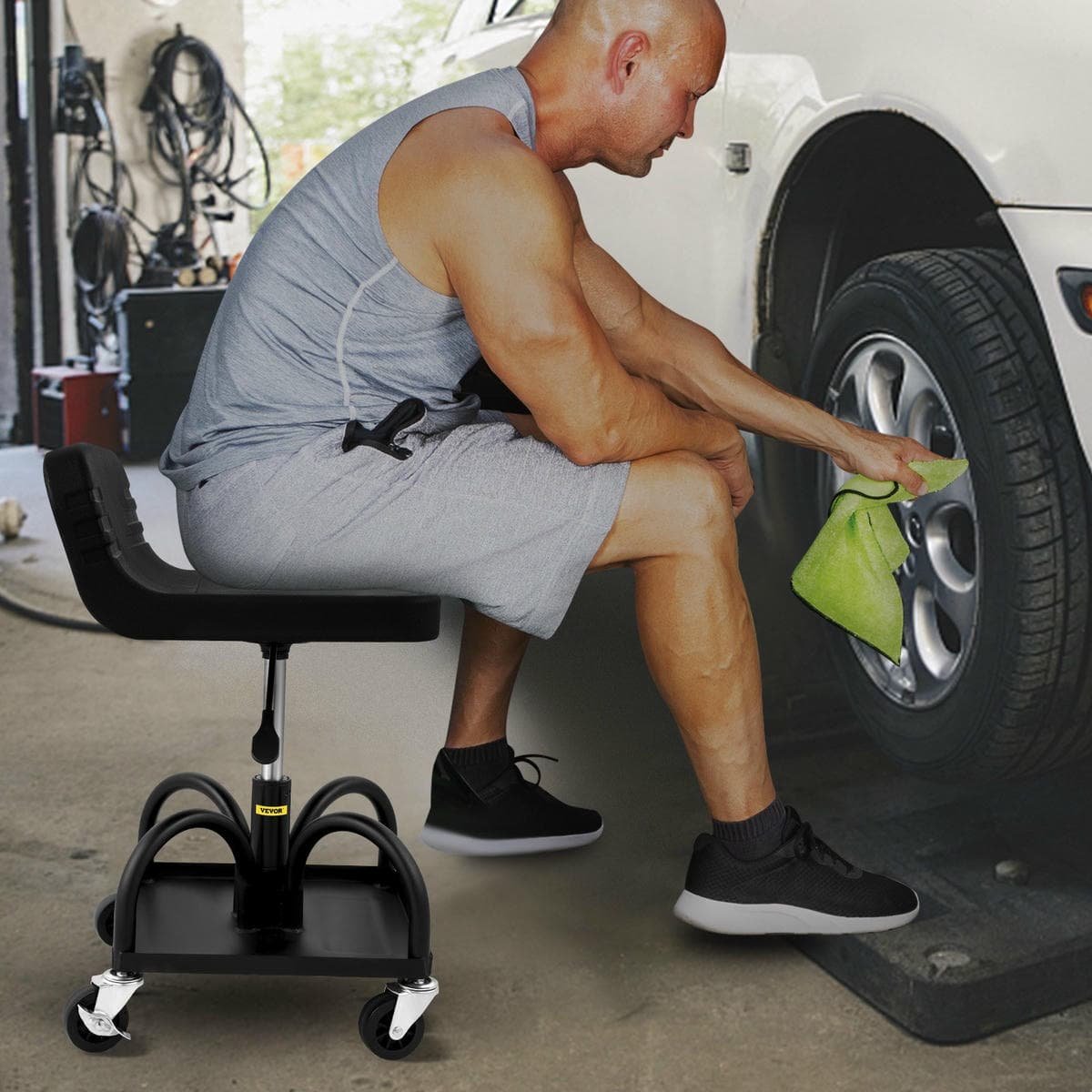 You can quickly adjust the height of the stool through the auto raise lever, from 15.7 in/40 cm to 20.5 in/52 cm. The adjustable height design can adapt to different users and different projects. Whether you want to wipe the top of the car or the bottom tires, you can adjust the seat’s height to reduce the stress on your back and knees.