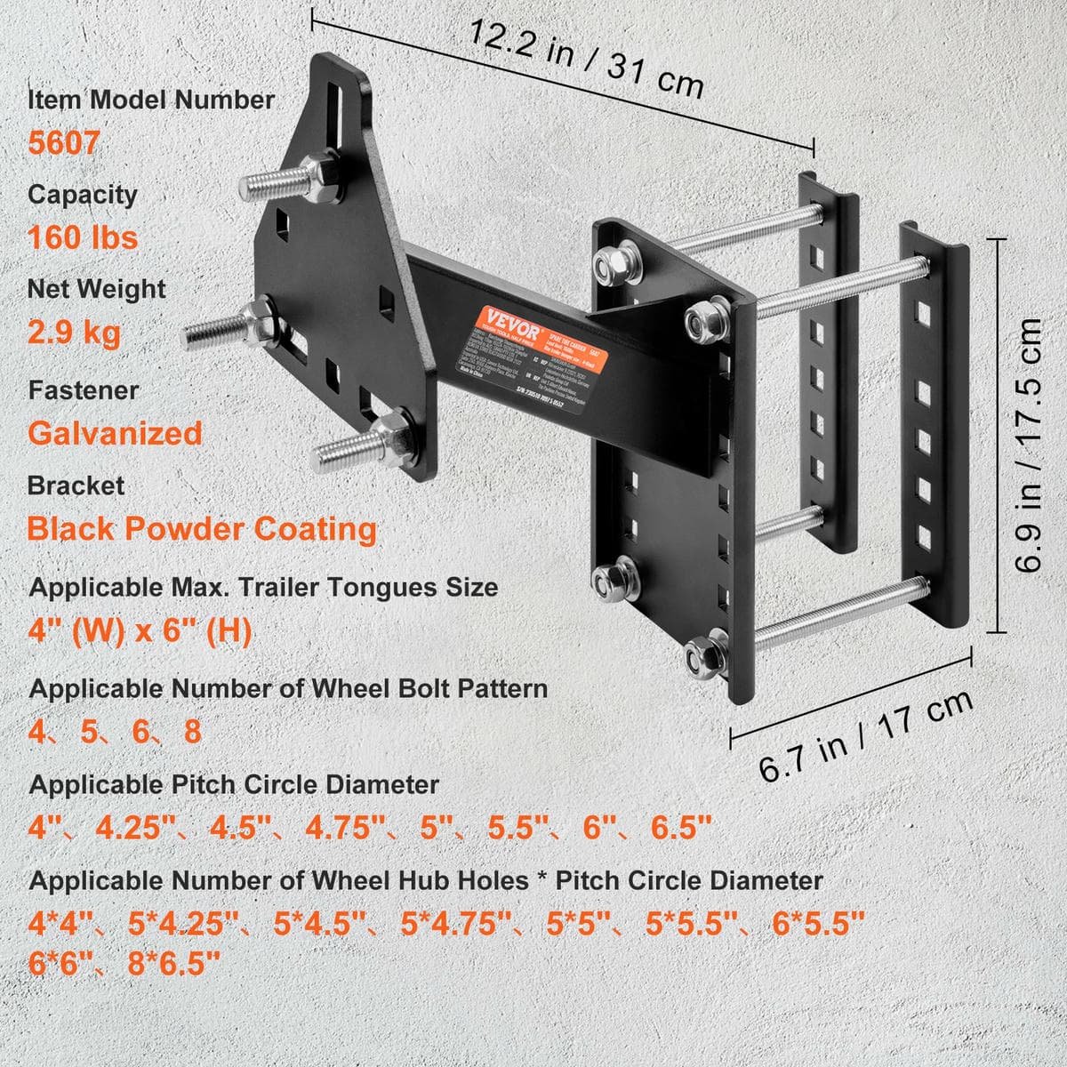 This trailer spare tire carrier is designed to fit a wide range of wheel sizes, making it suitable for various applications. It is compatible with 4×4″, 5×4.25″, 5×4.5″, 5×4.75″, 5×5″, 5×5.5″, 6×5.5″, 6×6″, and 8×6.5″ diameter hole types.
