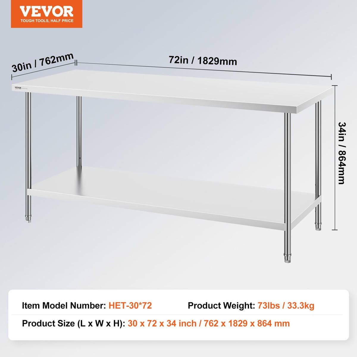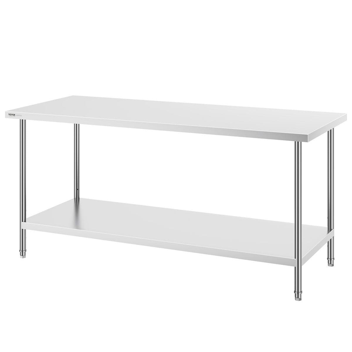 This work table, measuring 30 x 72 x 34 inch, is made from SUS201 stainless steel for the tabletop, shelves, and legs. It offers superior rust resistance, a sleek appearance, and a smooth surface that is easy to clean with a simple wipe. NSF certified, it meets strict public health standards, ensuring long-lasting protection for your health.