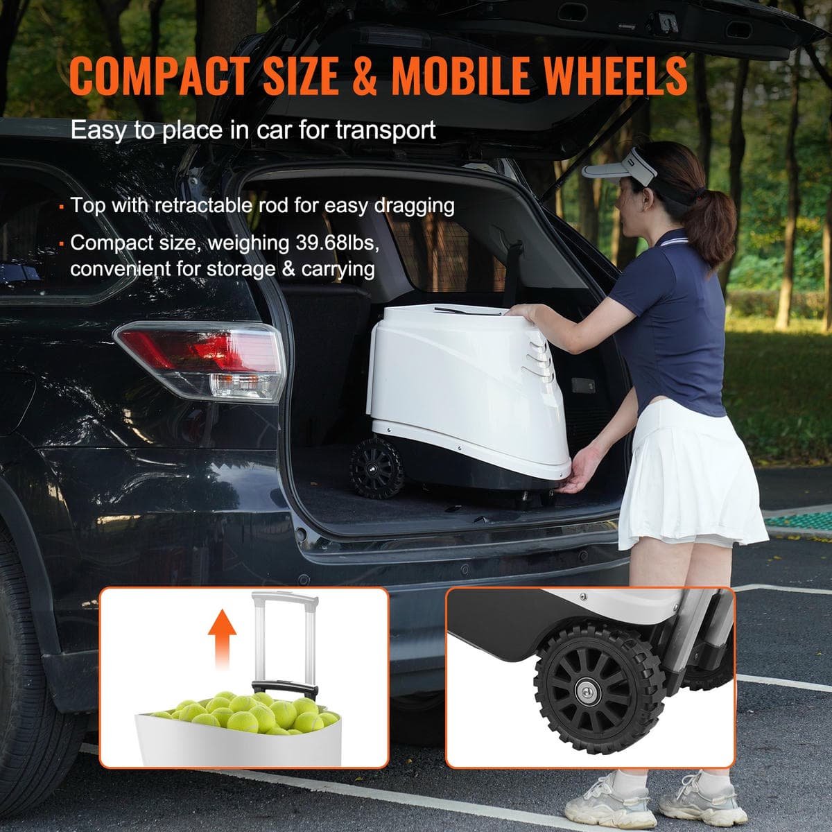 Weighing 48 lbs (21.8 kg), this automatic portable tennis ball launcher is compact and lightweight, easily fitting into the trunk of a car for convenient transportation. It features a retractable handle and wheels for easy portability and mobility.