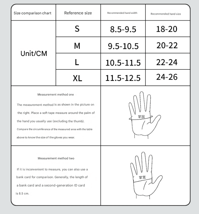 Note: To ensure maximum comfort and performance, please carefully measure your hand circumference and compare it to the sizing chart before making your purchase.